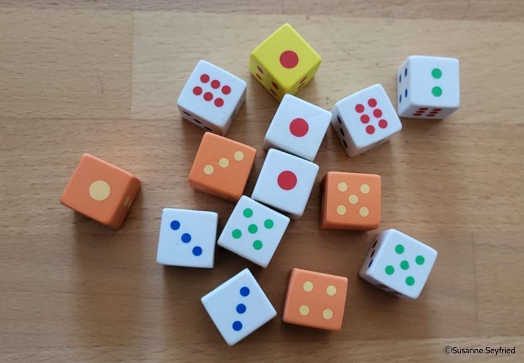 Absolut unverzichtbar in der Lerntherapie sind für mich Würfel. Je nachdem welche ich verwende (6er, 10er, Würfel mit Zehner- oder Hunderterzahlen) kann ich daraus so viel machen: Zahlzerlegungen üben, Plus- oder Minusaufgaben erwürfeln, Zahlen bilden, Stellenwert üben, Spiele spielen…